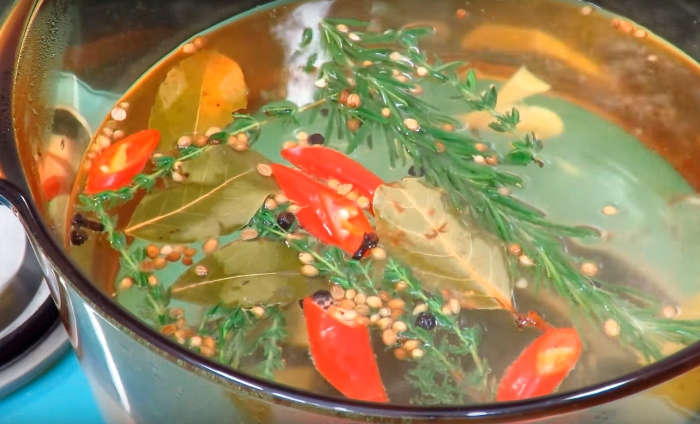 Поки м’ясо маринується в кефірі, приготуйте другу заливку. Для неї закип’ятіть 2,5 літра води в каструлі, додавши сіль (2 ст. л.) і спеції. Розмарин, чебрець і лавровий лист закладайте в каструлю, туди ж додайте перець горошком, гвоздику і коріандр, декілька нарізаних шматочків імбиру і перець чилі за смаком. Коли маринад закипить, зніміть його з вогню і дайте охолонути до кімнатної температури.
