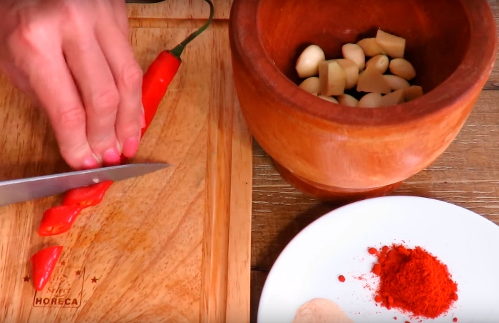 Наступний етап – приготування третього маринаду з часнику, імбиру, перцю чилі, розмарину, чорного перцю, паприки і сушеного часнику. Усі ці компоненти розітріть в ступці до однорідної маси, додайте пару ложок оливкової олії. Ароматною сумішшю будемо натирати буженину. Для цього дістаньте м’ясо з каструлі, витріть насухо паперовим рушником, залишків кефіру бути не повинно. Коли ви натрете буженину сумішшю спецій, залиште її ще на півгодини на столі. Так шматок краще промаринується і прогріється після холодильника.