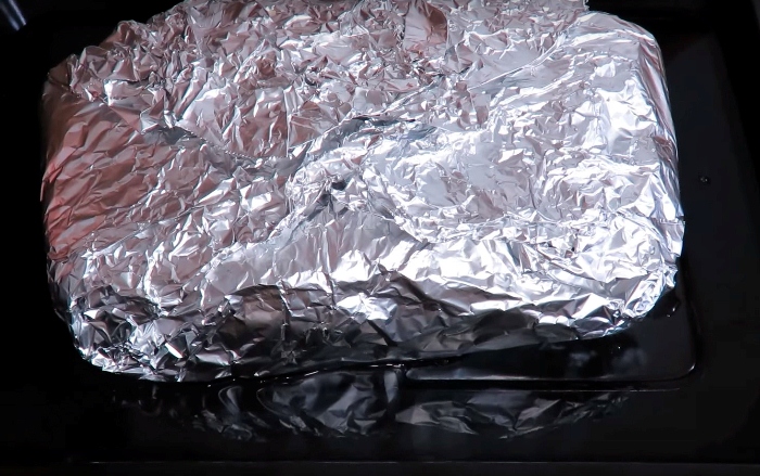 Для початку загорніть шматок щільно в декілька шарів фольги, щоб сік не витікав. Потім викладіть загорнутий шматок на деко і налийте на його дно склянку води. Тепер на годину надсилайте м’ясо в духовку, температура для запікання – близько 180 градусів. Після – відкрийте фольгу акуратно і потримайте ще хвилин 20, щоб скоринка на м’ясі зарум’янилася.