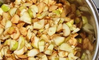 Добре вимити яблука, видалити наявні ушкодження у вигляді гнилі, вичистити серцевину. Шкірку не очищати не потрібно. Порізати яблука середньої величини часточками, помістити в посуд великого обсягу, придатну для приготування їжі на вогні. Важливо, щоб дно ємності було товстим.