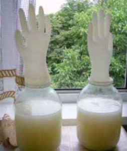 - Верх ємності закладають гумовою рукавичкою і проколюють один з пальчиків тонкою голкою.